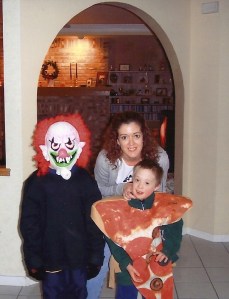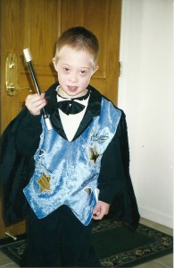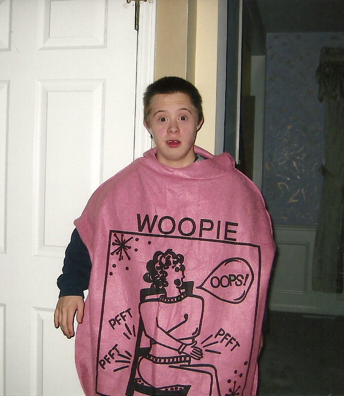 Halloween 2001, we had moved to Chicago where you have to bundle up for Halloween. Hank was so excited to be the creepy clown and scare his friend next door. Does anyone else have a creepy clown phobia? What I found for Nick with having Down syndrome and autism was the necessity to keep the costumes simple. There are many costumes that just slip over his head in one piece and without covering the face. These seemed to work the best for him.