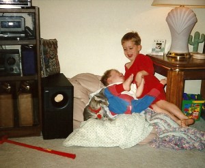 Sensory Seeking   a person goes out of their way to find more input in their world.  They crave stimulus.  This for the most part IS Nick’s world.  🙂 Often when he walks his feet will hit the ground loudly.  His “heavy walking” as we have termed it is seeking extra feedback.  If there is a puddle he will step hard into it to get the splash to seek input.  He chews on inedible objects in particular his sleeves.) Nick also likes to push buttons on the phone intercom, microwave and often turns up the volume on the TV to 96!  He delights in turning on the water faucets full blast.  So you see he is looking for more input in various ways. Check out Blog # 3~ “Getting your Goat” to get a complete picture and list of things that he has gotten his hands on and dumped out.