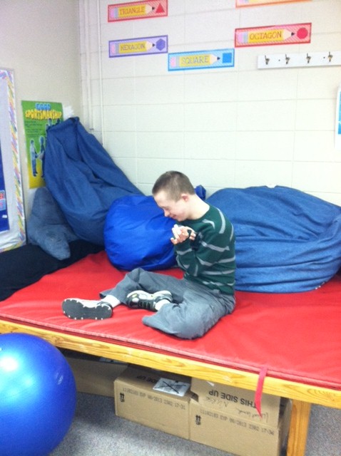 Once the “certificate of completion” is put on the shelf, we move into the next phase for Nick. The program is affiliated with the school district and called STEPS (Supported Training Experiences Post-Secondary). Under the *IDEA law, a student with special needs may continue with high school or enter a transition program up until they turn 22 years old. The decision for placement is based on the child’s individual needs. Students with developmental delays may benefit more by having extra time to work on vocational, social/leisure, self-help skills along with their educational training. Many students who are higher functioning academically may be able to take college courses and have paid jobs. Last week we had the opportunity to visit the campus and get a closer look at the STEPS program. Al attended the first session. I followed up with Nick since we had to do a team tag with him and went to the second session geared for graduating seniors. While we waited for the second meeting, Nick and I took a tour of the building. By the way, all but one fire alarm is not covered but I bet it will be soon.🙂 He loved the campus, especially the sensory room.