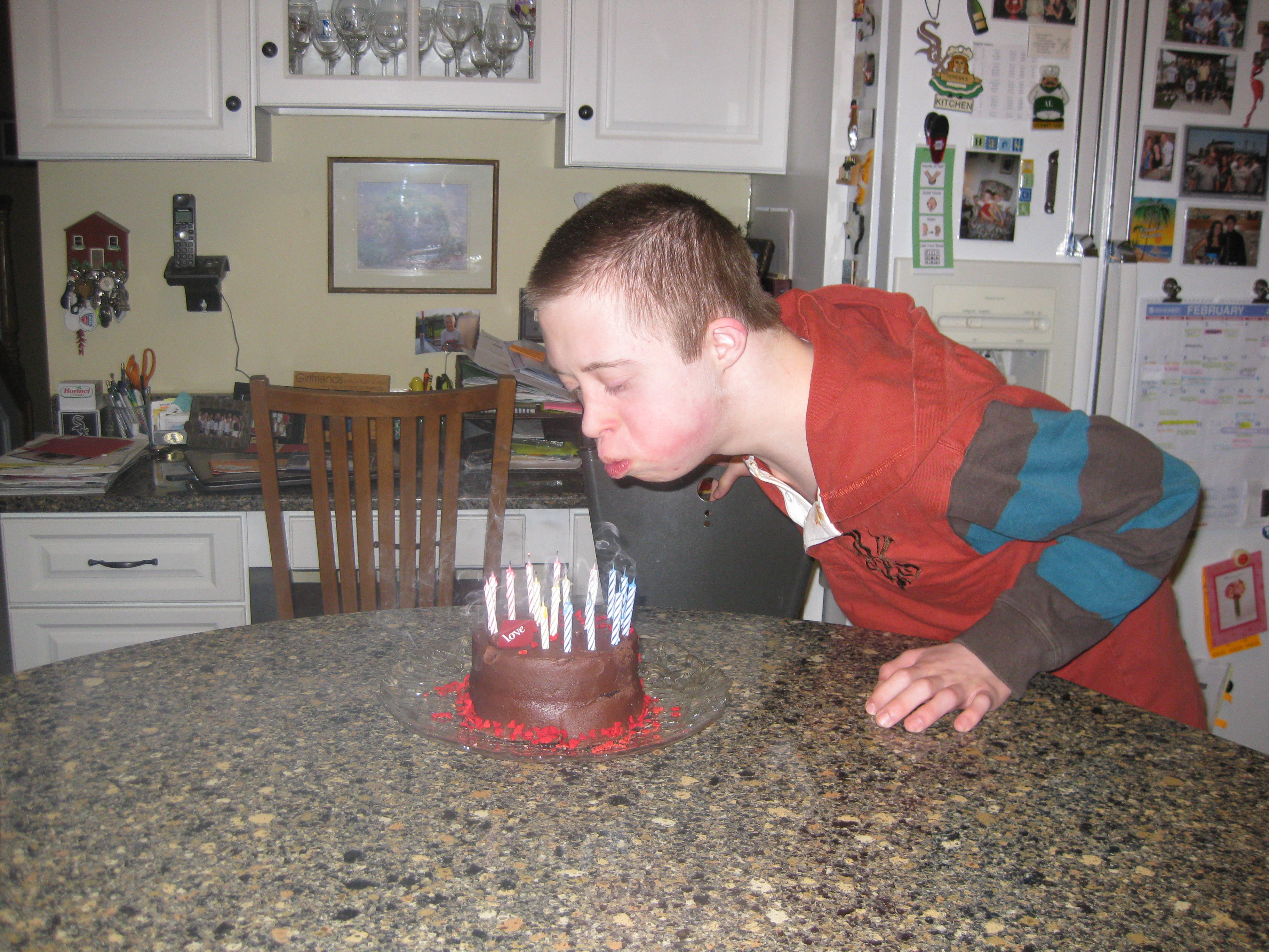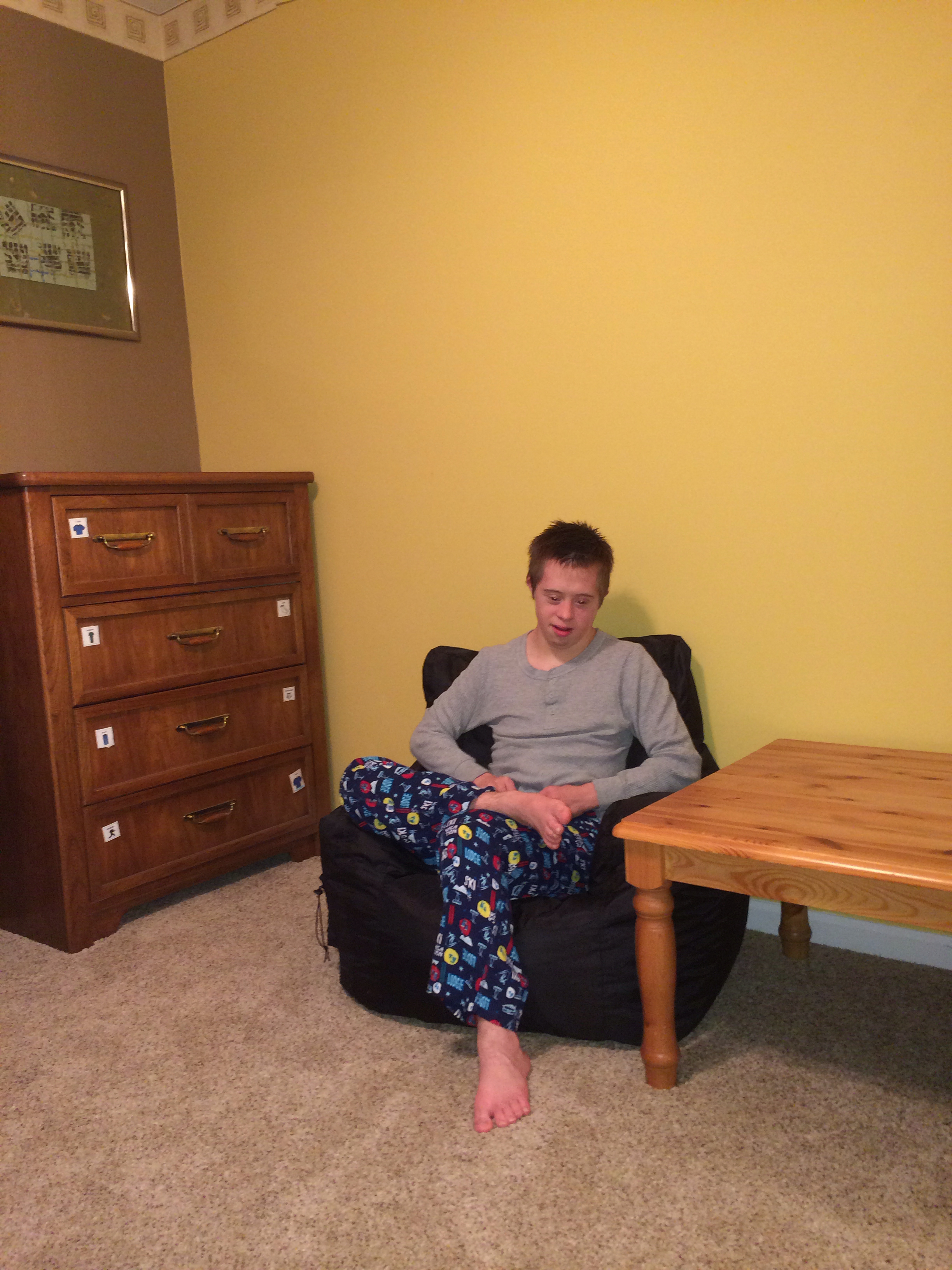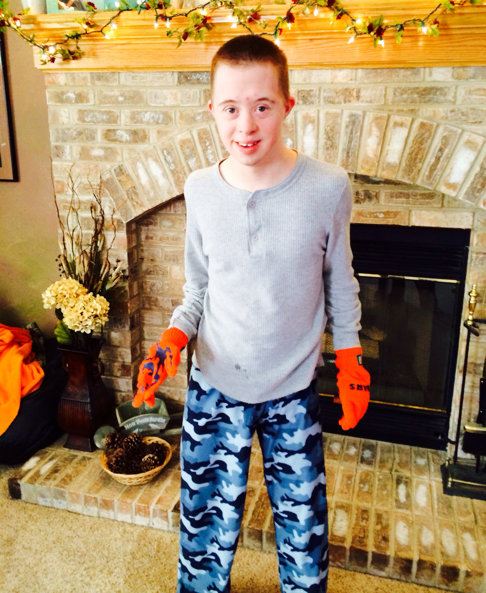 Many of my friends who have children with a dual diagnosis of Down syndrome and autism can relate. We can tell you at least one story about our youngsters stripping down buck naked for no apparent reason. That’s how our kids roll. Boy am I glad those naked days are over with Nick, especially this winter. As long as I can remember, it has been nearly impossible to keep hats, gloves and shoes on Nick in the winter. My friend, Susie use to share stories about Nick when the bus pulled up to get her son. As soon as the door opened, out came a flying shoe. Hardy har har….. Susie would have to pluck it out of the snow and hand it back to the bus aid. Well played Nick, well played. 🙂