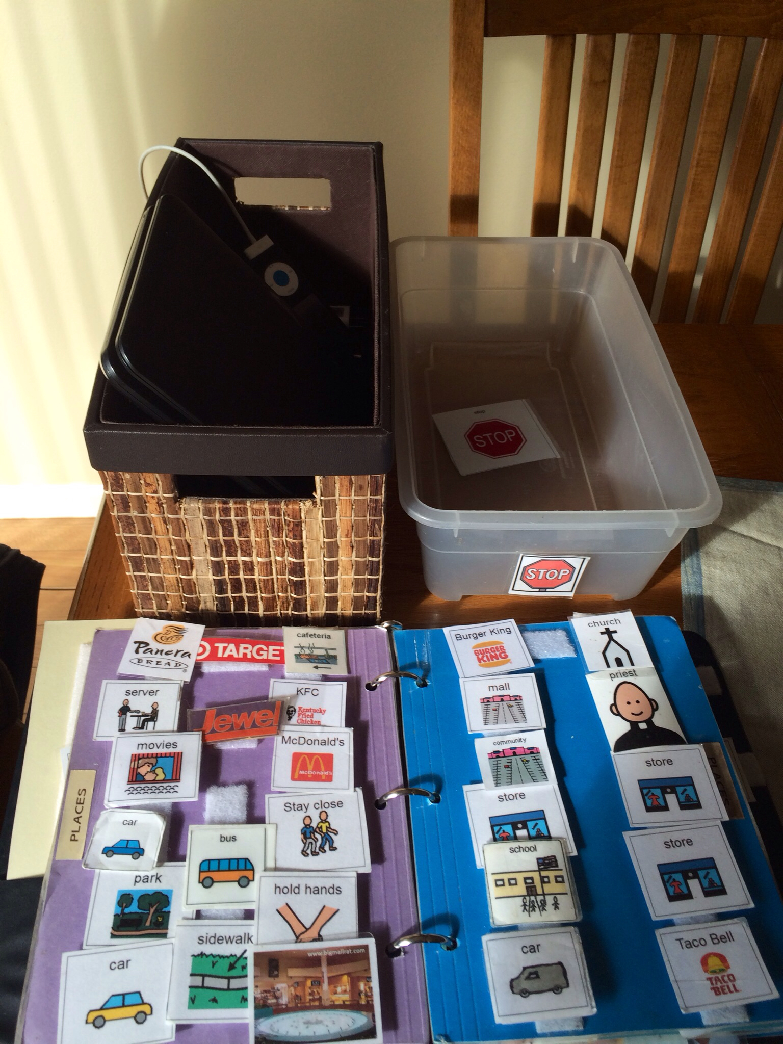I reported two weeks ago, that Nick’s talker (AAC device) has survived being dropped from the second floor of the Naperville Library and onto the railroad tracks off Montgomery Road. The case is sturdy but has taken a beating. Nick is 21 years old and has Down syndrome and autism. He’s a crafty one. It’s all we can do to keep up with his antics. The school team has come up with two things to secure his talker better.